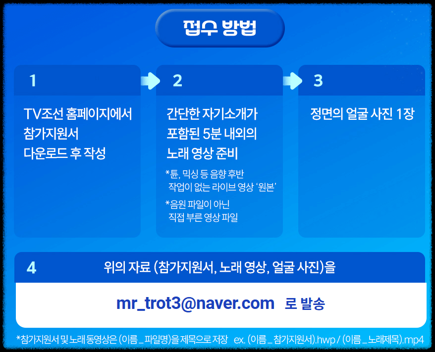 - 참가 지원서 다운로드하여 첨부파일과 함께 mr_trot3@naver.com 으로발송하시면 됩니다.