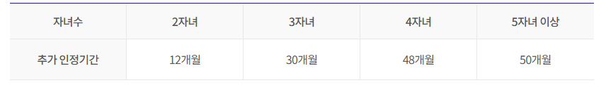 - 자녀가 3인 이상인 경우 : 12개월 + 2자녀를 초과하는 1인마다 18개월(50개월 상한)