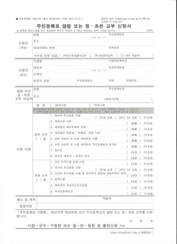주민센터에 비치된 "주민등록표 열람 또는 등.초본 교부 신청서"를 작성하셔서