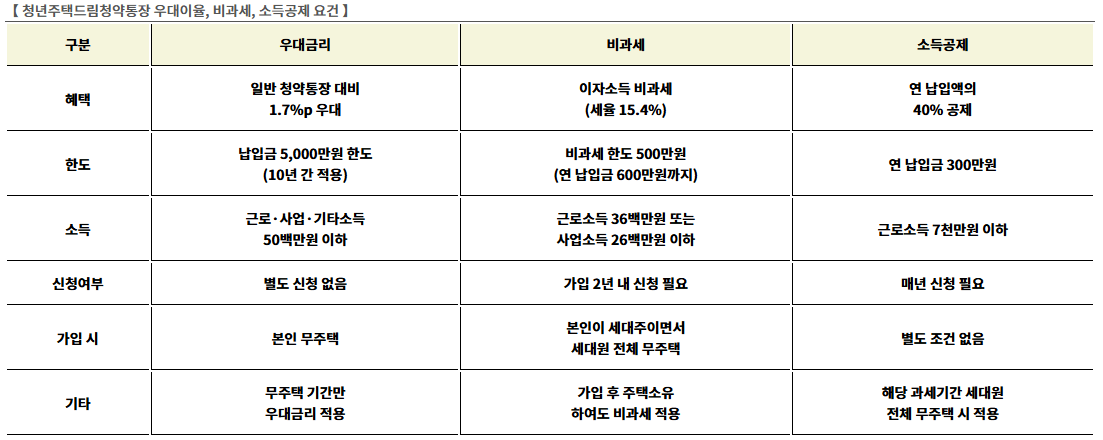 (청년주택드림통장에 가입한 자 중 소득초과자, 세대원이 주택을 소유한 경우, 직전년도 신고소득이 없는 경우 등은 이자소득 비과세 혜택에서는 제외될 수 있음)