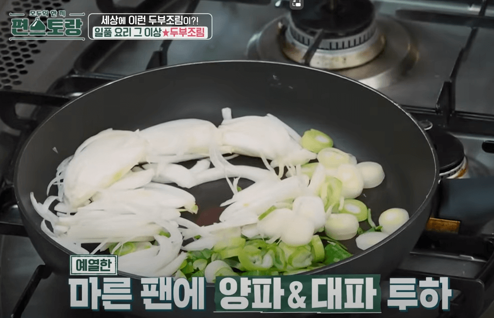1. 예열된 팬에 썰어둔 대파, 양파를 넣어 강불로 굽는다. (기름을 두르지 않고 굽는것이 포인트)