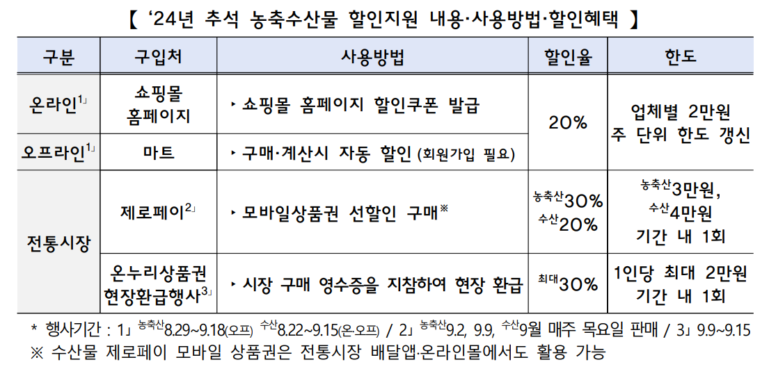 ➀ (온·오프라인) 업체별 주(週)당 할인한도를 1→2만원으로 확대하고 주요 성수품 최대 60% 할인 지원