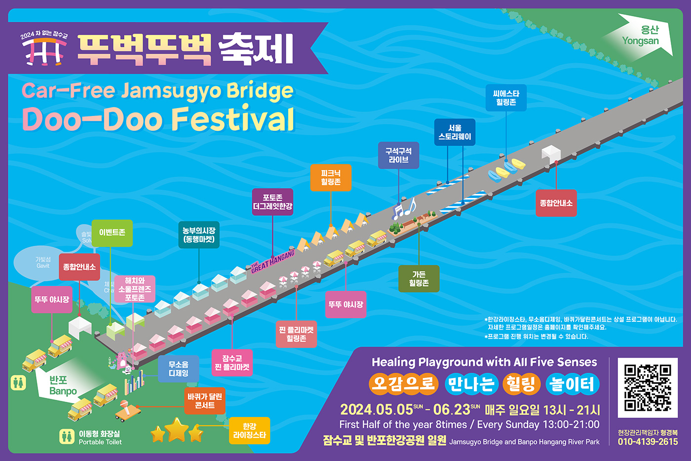 2024 차 없는 잠수교 뚜벅뚜벅 축제는 오감으로 만나는 힐링 놀이터의 컨셉으로 개최한다. 매주 일요일, 몸과 마음을 쉬어갈 수 있는 한강 위의 축제 놀이와 힐링을 동시에 즐기며 컬러풀한 한강으로 충전할 수 있는 축제이다. 매주 특별한 프로그램과 다양한 공연, 힐링존, 푸드트럭 등을 준비하고, 전국의 농부들을 만나볼 수 있는 농부의 시장, 플리마켓, 놀이 체험 공간 등 다양한 즐길 거리를 구성하여 참여하는 행사 방문객들에게 즐거움과 휴식을 동시에 제공하고자 한다. 잠수대교를 보행자 친화적인 공간으로 탈바꿈시키는 활기 넘치는 행사로 아래의 상반기 프로그램 정보를 참고하여 축제에 함께 참여해 보세요!!